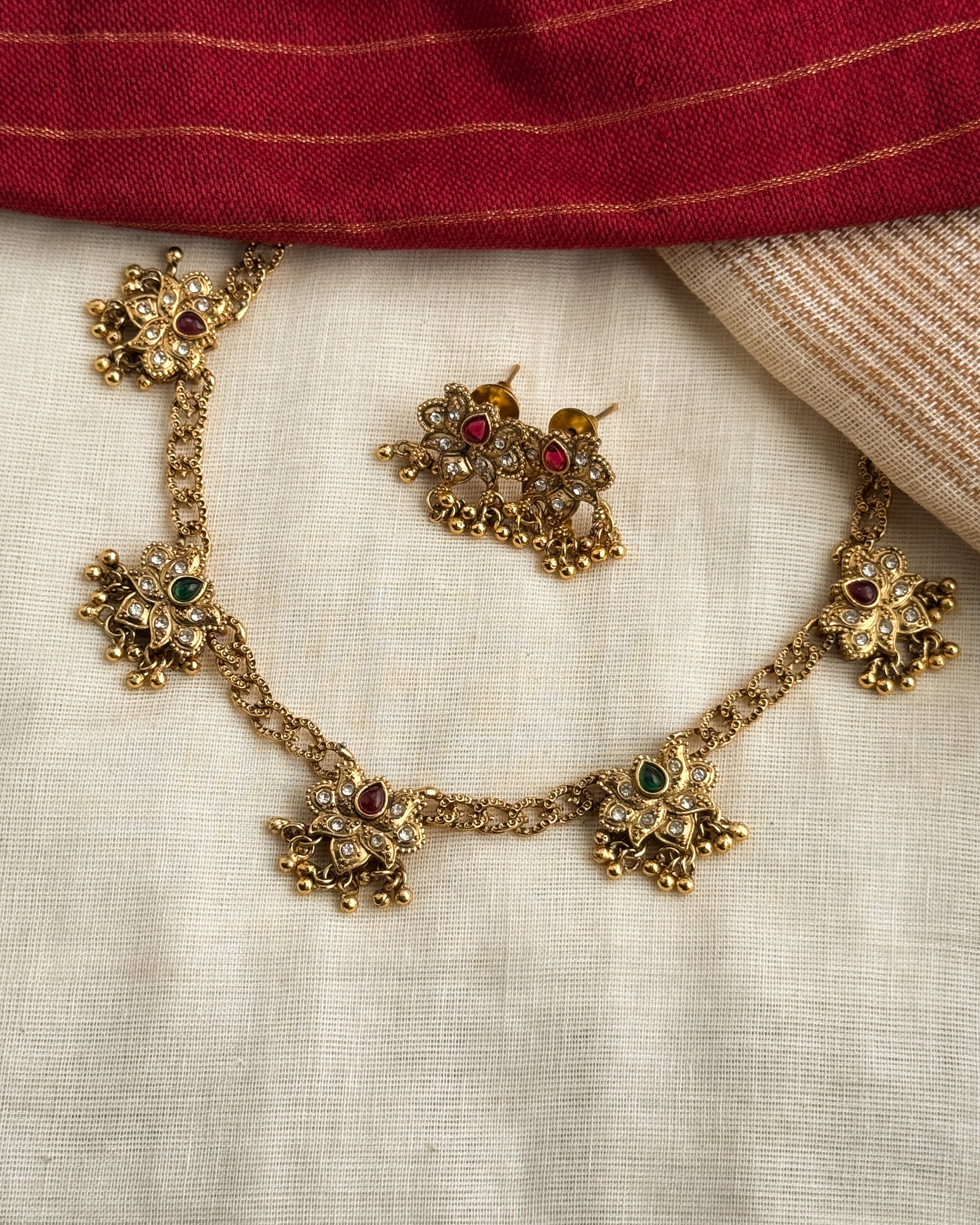 A graceful multi-pendant necklace featuring elegant lotus motifs accented with semi precious white,red and green stones. Finished in a rich antique gold tone, this piece blends traditional charm with soft, feminine detailing—perfect for festive wear, ethnic celebrations, and elegant temple styling.