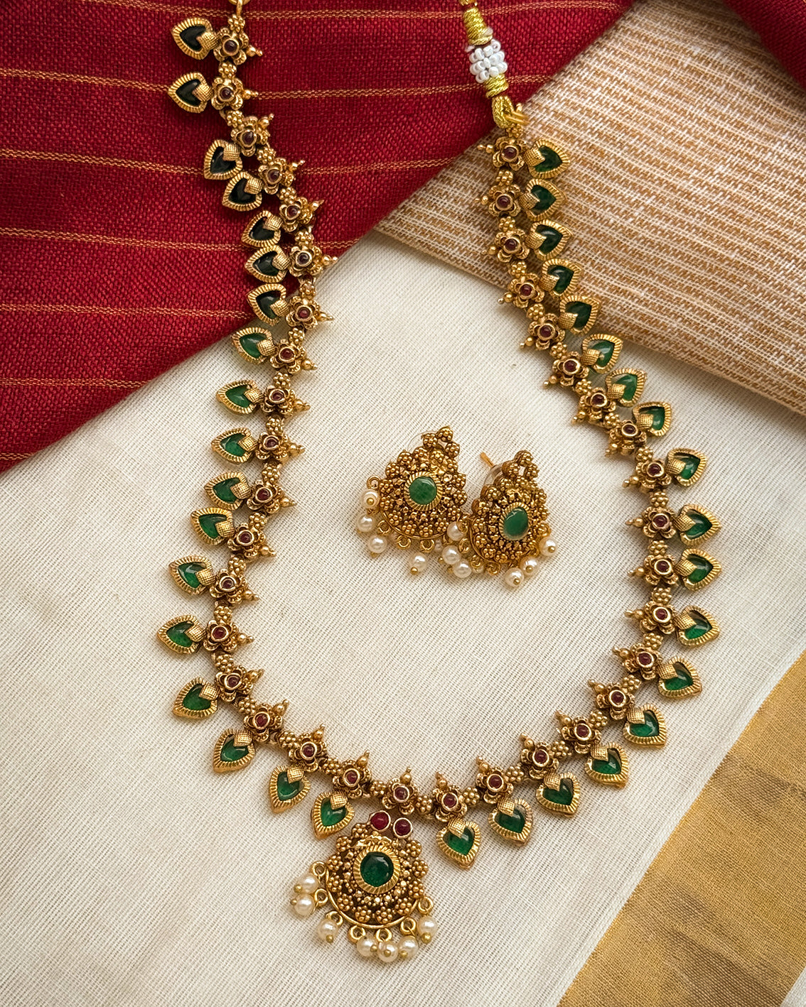 A classic South Indian long haaram featuring signature paalakka motifs and sparkling stones. Lightweight, elegant, and perfect for weddings, festivals, and traditional outfits. A timeless piece that adds instant heritage charm to any look.