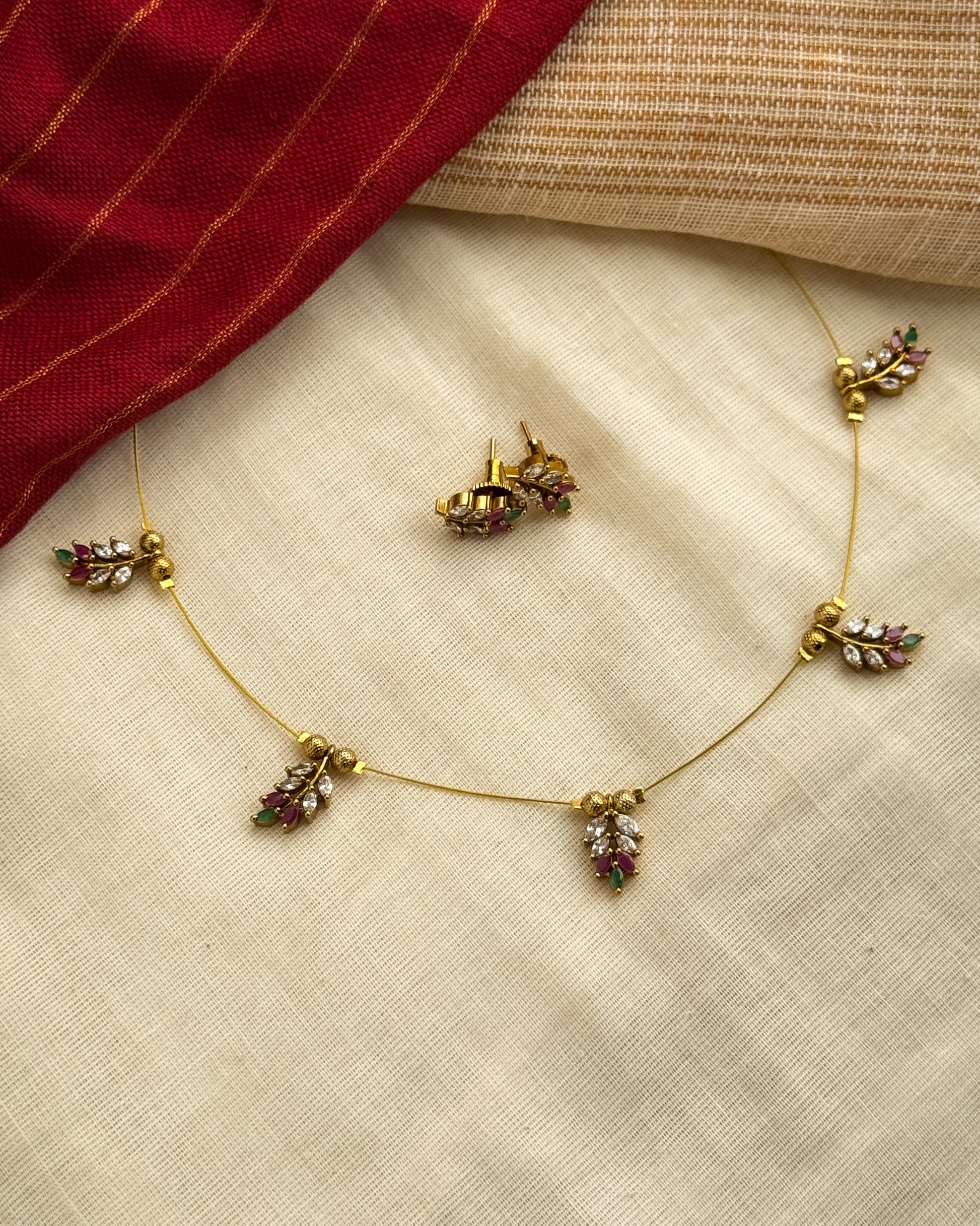 A sleek premium invisible-chain necklace adorned with elegant leaf motifs set with white, ruby, and green stones. The clean, floating design gives a delicate yet luxurious look, making it perfect for festive outfits, bridal styling, and modern ethnic wear.
